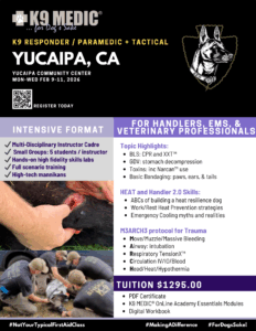 We’ve been working with handlers and medics for 15yrs and, with extensive experience and the review of many different integration methods, have created ways to make a mixed program level course very successful. When students register we will gather exist levels of human/veterinary medical skills. Students with similar skills levels are placed together in the same groups for skills rotations. During scenarios the different groups are distributed so that Handlers and Medics work side-by-side, just like the real world.