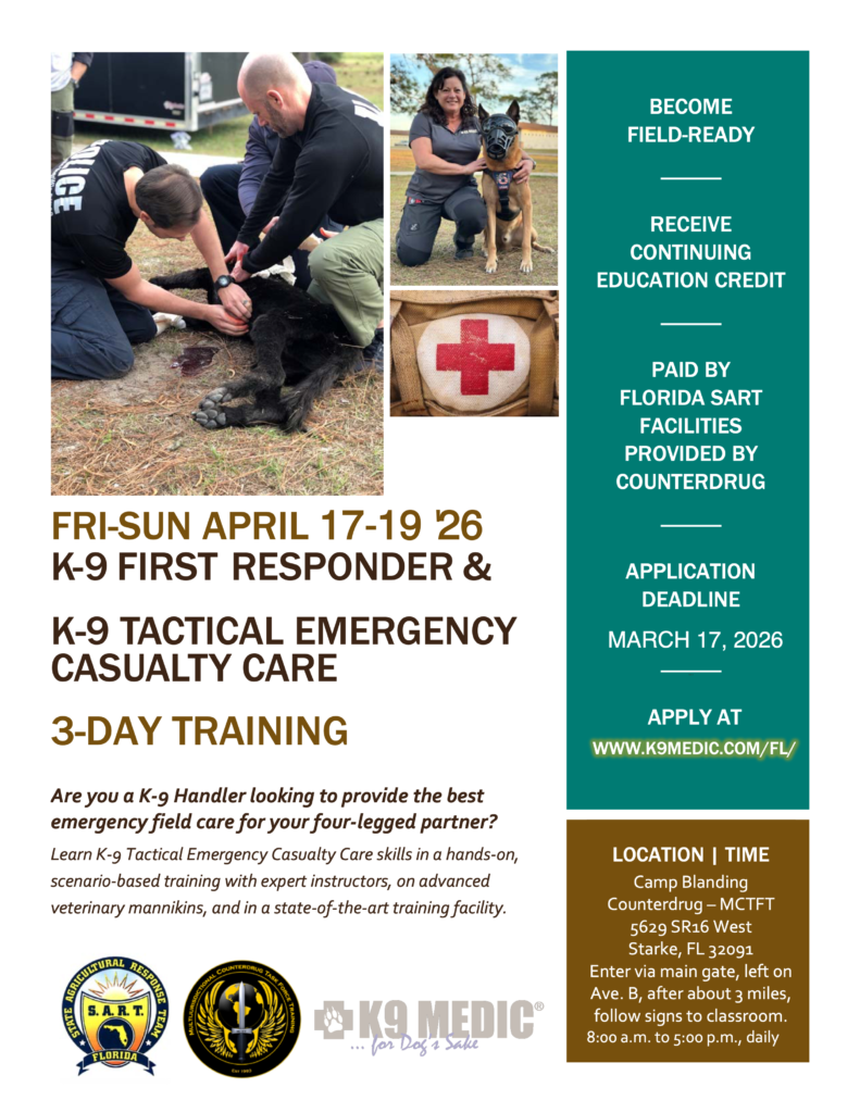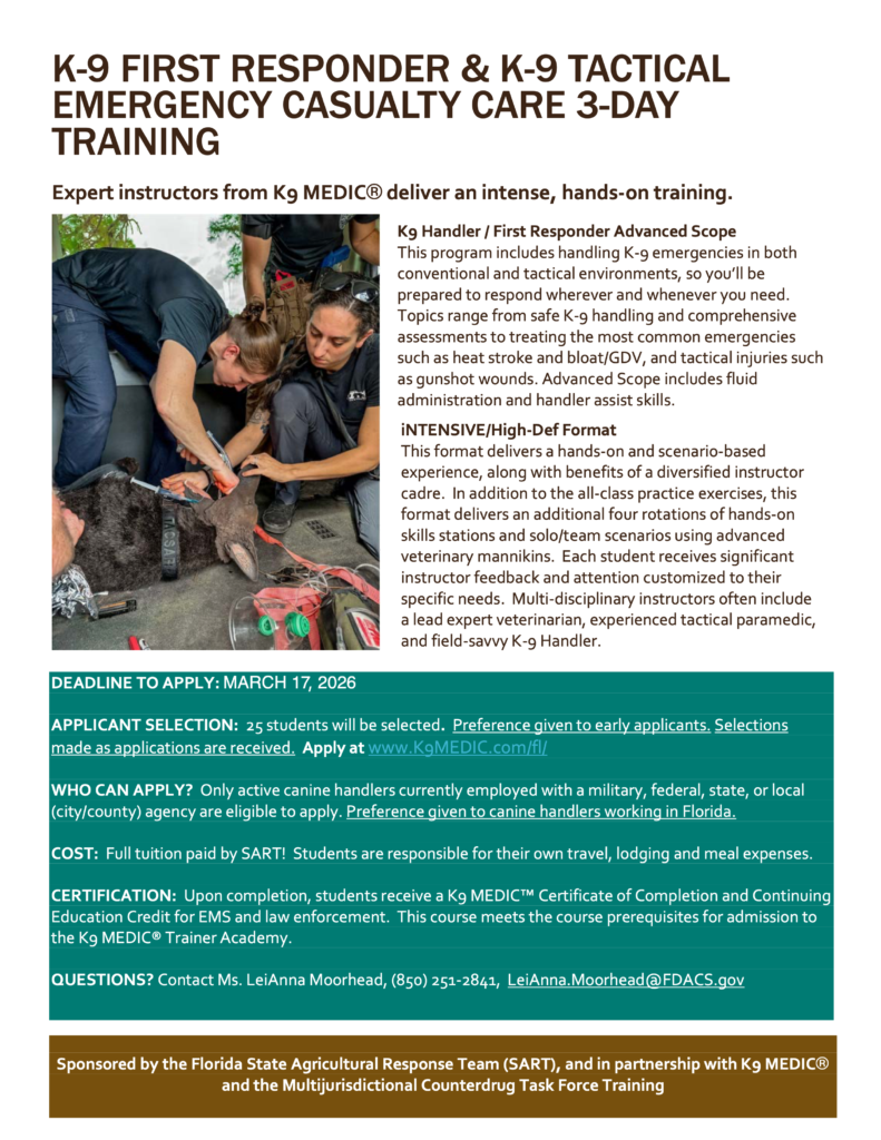 Priority will be given to Uniformed K9 Handlers in Florida. However, we may be able to accommodate other students, so please apply regardless!